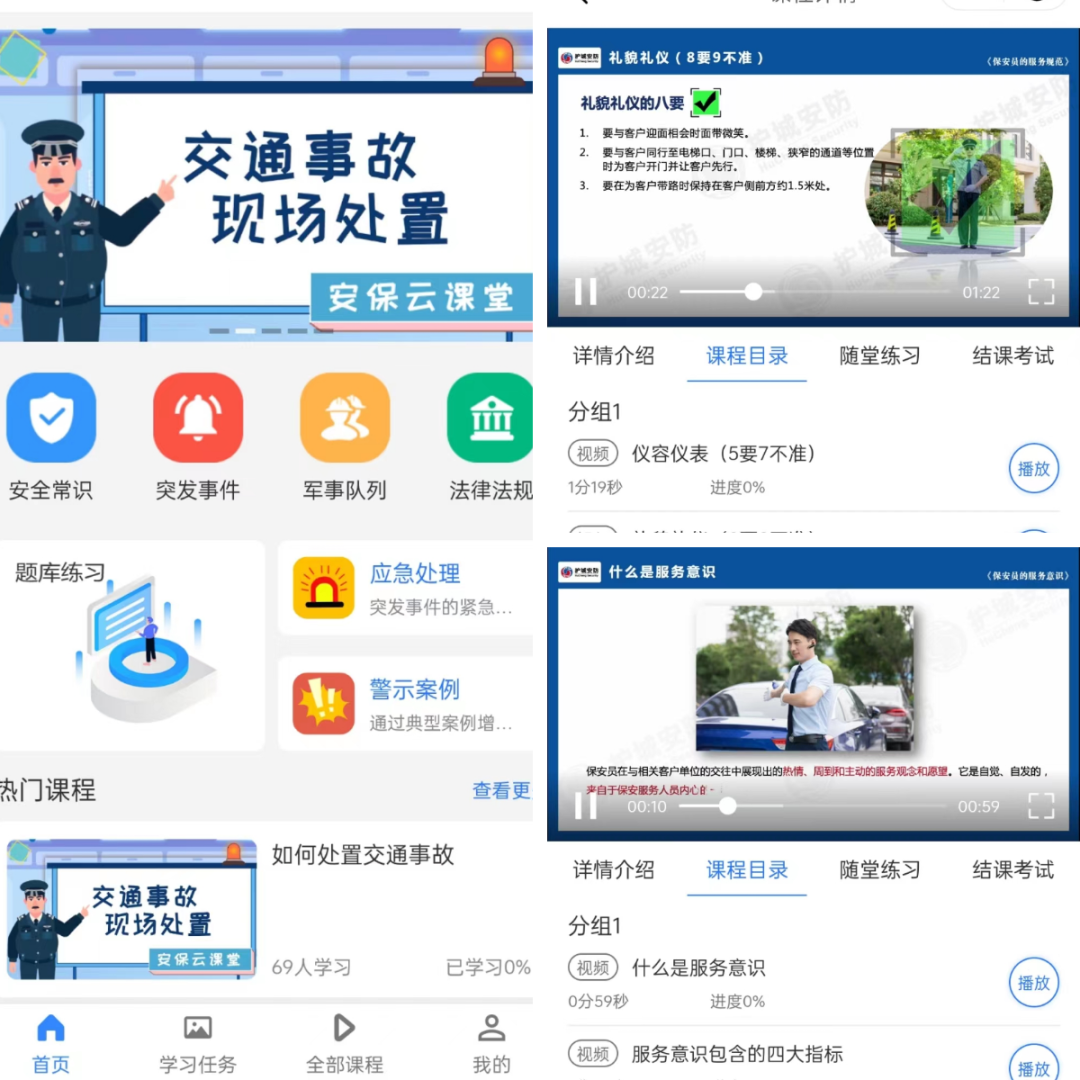 “安保云课堂”小程序涵盖了岗前培训、安全常识、军事队列、法律法规、题库练习五大学习版块。学习版块以文字和视频形式呈现。视频采用场景化直观教学,激发学员学习与参与欲望。保安员证考试题库版块依据《保安服务管理条例》和《保安员国家职业资格评价培训教程》倾心打造,题库内容齐全且操作简单便捷。公司的培训课程分为线上学习和线下培训两部分,利用碎片化的时间学习更多的专业技能。
